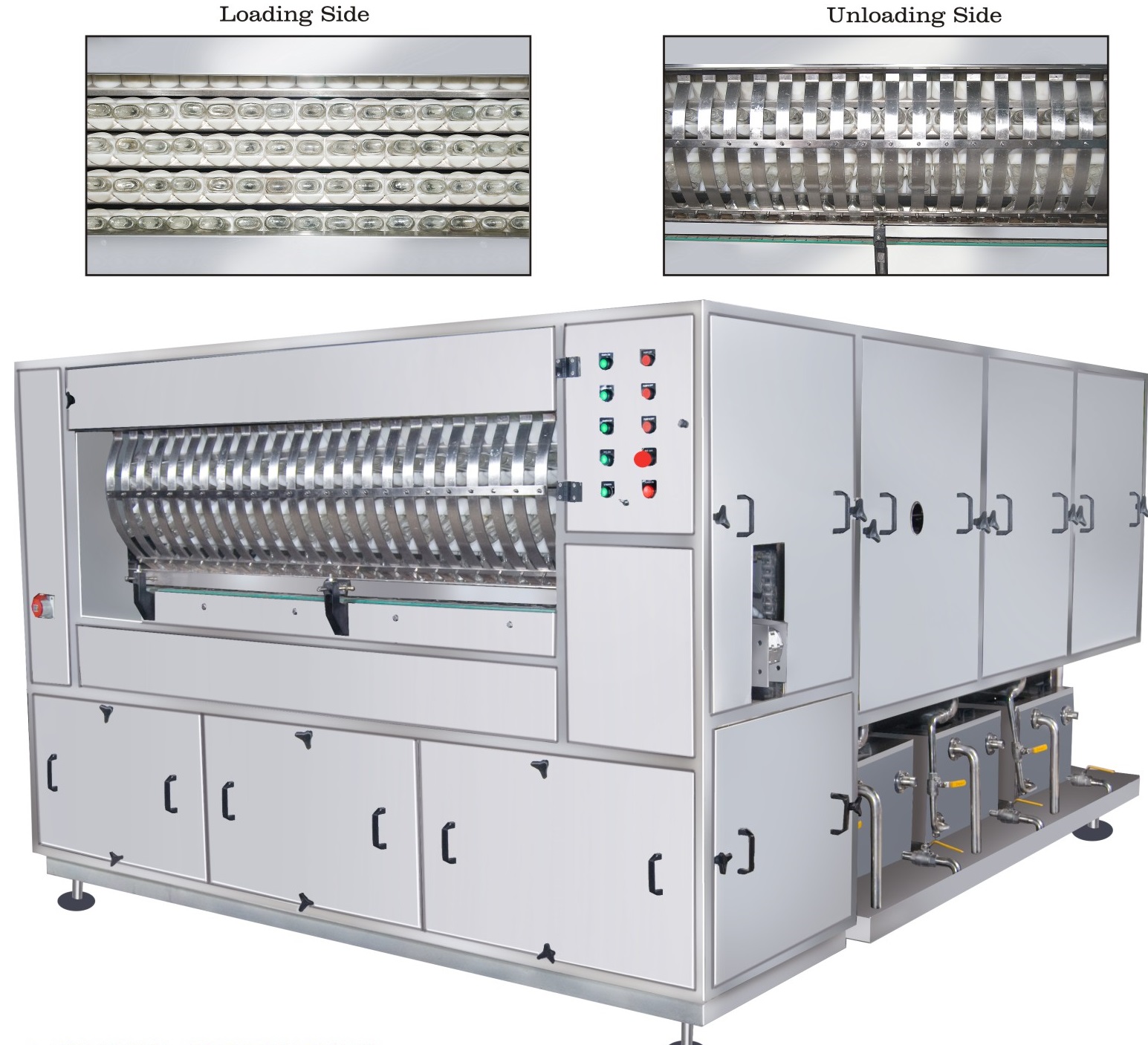 Manual Loading & Automatic Unloading .This machine has wide Application in Distilleries, Food and Beverages etc. Industries and is suitable for rinsing flat shaped bottles. Bottles are fed manually into the pockets. Three rinsing cycle gives prolonged and thorough rinsing with flexibilities of different washing media i.e. underground water, DM Water, Hot water etc. and its re-circulation.