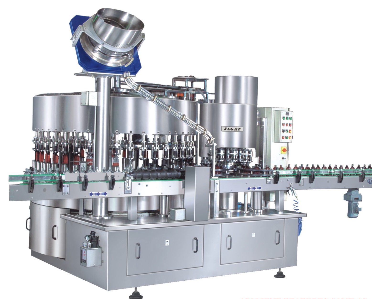 Monoblock is a compact Rotary Machine wherein Gravity Filling and ROPP Cap Sealing operation have been integrated on a single base frame in order to minimize initial investment, manpower and length of filling line without sacrificing output and quality. Bottles are filled by gravity through the specially designed nozzles, which are mounted at the bottom of the tank. Since Filling nozzles have direct contact with product tank, having no interconnecting PVC tubings which ensures no contamination. These machine are ideal to fill and seal non - carbonated and non-viscous liquid in pet bottles e.g. Mineral water, Juice, Milk, Liquor, Vinegar etc. The machine can be opted with provision of partial vacuum for application in glass bottles.
